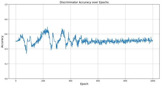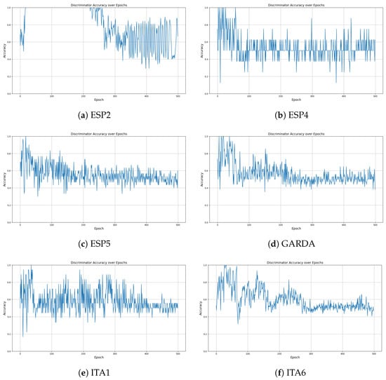 Figure 6 shows the discriminator’s training accuracy per epoch for each dataset, demonstrating that each quickly converges to the target accuracy. This is a result of the newly applied attention mechanism and loss calculation technique. The accuracy here refers to the ability of the discriminator to classify real and synthetic data. An accuracy of around 50% indicates that the discriminator cannot differentiate between the two, signifying that the generator is producing realistic synthetic data. Therefore, achieving an accuracy near 50% is desirable, as it reflects the success of the generative model in mimicking real data as shown in Figure 7. Additionally, Figure 8 illustrates a comparison between the actual data and the synthetic data generated targeting the ESP5 dataset for each feature. The results indicate that the model has effectively learned the temporal relationships of the data to generate values at specific timestamps as shown in Figure 9. This finding is consistently reflected in Table 2, where various similarity metrics numerically compare the actual data and the synthetic data.