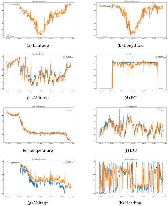The ability of spatial attention mechanisms to focus on important correlations between different sensor readings, especially voltage, temperature, latitude, longitude, and EC, emphasizes robustness and efficiency in accurately replicating real-world sensor data, including capturing outliers observed around 09:10:13 as shown in Figure 10, ensuring high fidelity in synthetic data generation. This high level of accuracy and realism in synthetic data is crucial for several following reasons.