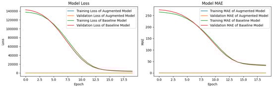 We demonstrate the effectiveness of the proposed augmented model in improving the performance of drone sensor data analysis, as shown in Figure 11. We implement a simple regression model based on a fully connected layer and compare the performance of the baseline model, which is a model using existing data, and the augmented model using augmented data. According to the results, the proposed augmented model shows almost overlapping curves in both loss and MAE for training and validation. This indicates that the values are on a much lower scale compared to the baseline model, implying that the augmented model learns significantly faster. This can be attributed to the use of the attention mechanism, which allows the model to achieve optimization quickly with fewer epochs. In summary, we leverage synthetic data generated from GANs using a novel spatiotemporal attention mechanism to improve both loss and MAE metrics over each epoch, effectively alleviating the limitations caused by less data.