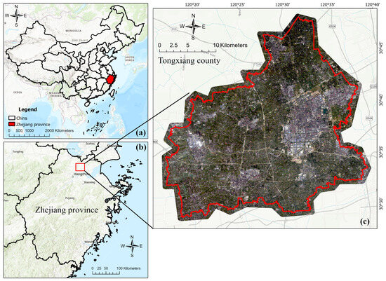The study area of Tongxiang County and the Beijing-3 image of Tongxiang on 21 October 2023. (a) The map of China and Zhejiang province, highlighted in red, (b) the map of Zhejiang province, the study area is highlighted in red square, (c) the Beijing-3 image of Tongxiang County, the county boundaries are shown in red.