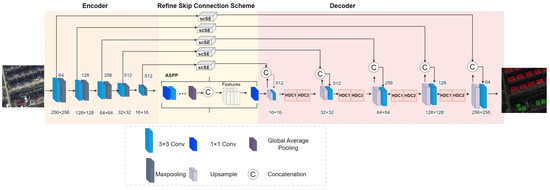 The UNet framework uses a symmetric “U-shape” structure with the same numbers for down-sampling (encoder) and up-sampling (decoder), and both sides of the network are symmetric to ensure the resolution of the input and output images remains constant. Another main feature of the UNet network is skip connections, which connect symmetric down-sampling and up-sampling levels. Feature information at different levels is then fused to reduce the loss of features. This method improves the segmentation results in the details. Therefore, in UNet framework applications, modular improvements can be made in the down-sampling and up-sampling processes, and the skip connection process. In our study, the encoder was enhanced with the ASPP block and the scSE block was embedded in the skip connection. Additionally, the HDC block was implemented within the decoder to facilitate more effective feature fusion.