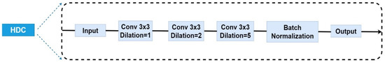 Through comparative experiments, we found that the best segmentation results can be achieved when the dilated rate is (1, 2, 5). The convolutional layers with dilated rates of (1, 2, 5) were connected sequentially, then the batch normalization layer and the ReLU activation function were used. The HDC block is shown in Figure 5.