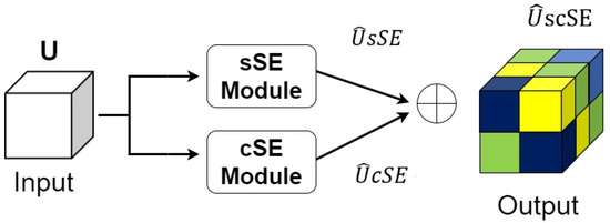 The scSE block structure (Figure 6) started with an input feature map U (with H × W × C dimensions), then it entered the branching structure to extract both the spatial and channel feature information, after which these two features were summed up in Equation (3):