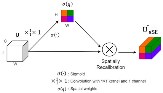 In the sSE module (Figure 7), convolution with kernel and 1 channel was performed to obtain an attention matrix of dimension (1, H, W). The sigmoid function was then used to generate the final weight matrix. Lastly, the weight matrix was multiplied with the original map in the spatial dimension.