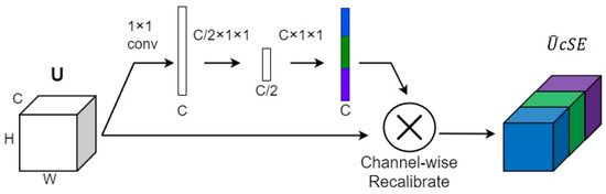 In the cSE module (Figure 8), first a convolution was performed on the input feature map, then the number of channels of the input feature map was down-sampled from to by a fully connected layer and ReLU activation function. Followed by normalization through another fully connected layer and a Sigmoid function, the dimension was up-sampled back to 1 × 1 × C. Finally, the weight map was multiplied by the original feature map in the spatial dimension to derive the spatial weights of different spatial locations.
