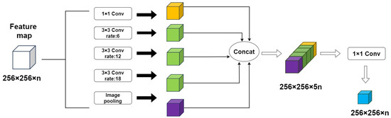 The structure of the ASPP block. The data dimension input the ASPP module is 256 × 256 × n, where n is the number of channels for input data at the current layer. In this study, n is 512 and 256 × 256 is the spatial dimension after resizing. The number of feature map dimensions for each branch output is 256 × 256 × n. Thus, the five branches yield a total of five feature maps in 256 × 256 × n dimensions. Finally, the five feature maps are superposed into a feature map with 256 × 256 × 5n dimensions. The different colors of blocks represent the output feature maps from different dilated convolution.