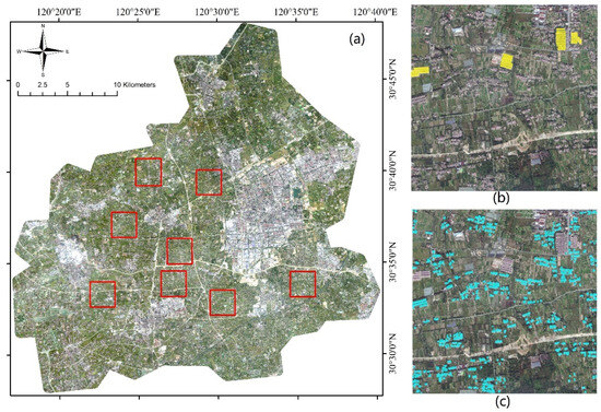 Ancillary data were collected in the form of land-use planning maps for rural villages (provided by the Bureau of Land and Resources, Tongxiang, China) and used as reference data in the image labeling step. All remote sensing images and vector data were adopted by the China Geodetic Coordinate System 2000 (CGCS2000) for projection.