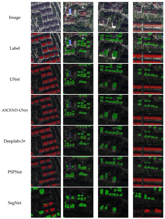 In this study, widely used semantic segmentation models were selected for comparison, including PSPNet, UNet, DeepLabV3+, and SegNet. The same training and test datasets were used to evaluate the models’ performance. The segmentation results obtained from different models are illustrated in Figure 11, where four sets of rural settlements with different shapes, sizes, and distribution patterns from remote sensing images are presented.