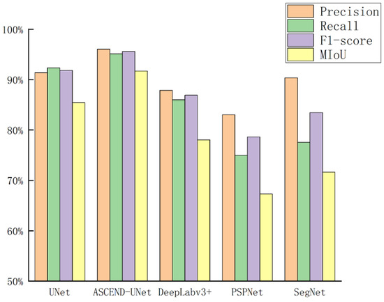 By comparing the precision, recall, F1-score, and MIoU of each model in Table 3 and Figure 12, it was found that the ASCEND-UNet outperformed all other original models. The ASCEND-UNet achieved a significant improvement compared to the original UNet model, with 4.67%, 2.80%, 3.73%, and 6.28% increases in precision, recall, F1-score, and MIoU, respectively. The ASCEND-UNet captured the multi-scale spatial characteristics of rural settlements more effectively and provided more accurate results when distinguishing different types of them. In addition, ASCEND-UNet showed good robustness in complex background scenarios.