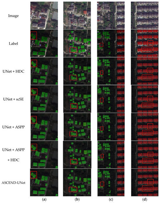 To evaluate the performance of the individual blocks in the ASCEND-UNet, we conducted a study that gradually incorporated the HDC, scSE, and ASPP blocks into the UNet network architecture. In Figure 13a,b, it was observed that the combination of UNet and HDC performed better in segmenting the building edges. In contrast, ASPP and scSE were found to be less effective in delineating building edges. While ASCEND-UNet showed the clearest and most accurate building edges. In Figure 13c, misclassification occurred when only the HDC and ASPP blocks were added. However, when HDC and ASPP were combined, some of the misclassified small objects were corrected. In Figure 13d, where the buildings are regular in shape and densely arranged, all the blocks incorporated into the UNet model depicted the edges of the buildings accurately, and there was no misclassification.