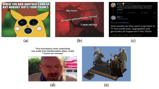 - Hwang, E.; Shwartz, V. MemeCap: A Dataset for Captioning and Interpreting Memes. arXiv 2023, arXiv:2305.13703. [Google Scholar]
