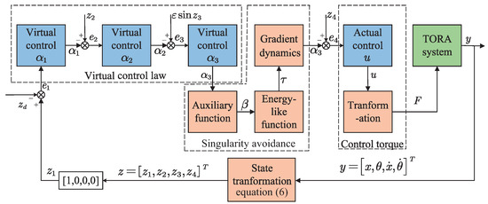 As a classical underactuated system [1,2,3,4], the translational oscillator with a rotational actuator (TORA) is a simplified model of dual-spin spacecrafts that was originally used to study the resonance capture phenomenon and the despin maneuver [5]. It is also used as a benchmark system for the design and performance test of various nonlinear control algorithms due to the characteristic of strong coupling and high nonlinearity [6,7]. From the point of application, the TORA system serves as an active mass damper (AMD) in engineering to suppressing vibrations in large-scale structures like super high-rise buildings, long-span bridges and offshore floating wind turbines [8,9,10]. Moreover, with appropriate modifications, it facilitates the investigation of self-synchronized phenomena in various mechanical systems such as vibration sifters, hands-held vibration tools, and vibration conveyors [11]. Therefore, the research of the TORA system holds considerable theoretical and practical significance. However, the TORA system is characterized by having fewer independent control inputs than the number of degrees of freedom, which makes the control design of the system extremely challenging.