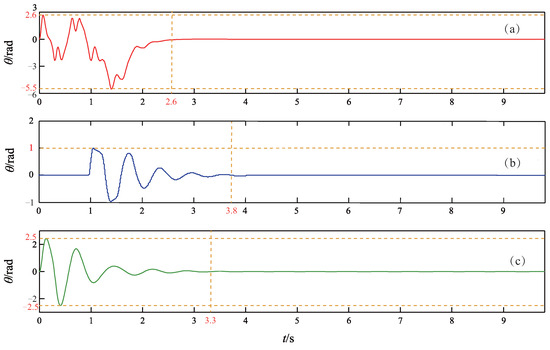 Time response curves of the ball angle . (a) Proposed method. (b) Method in [45]. (c) Method in [39].