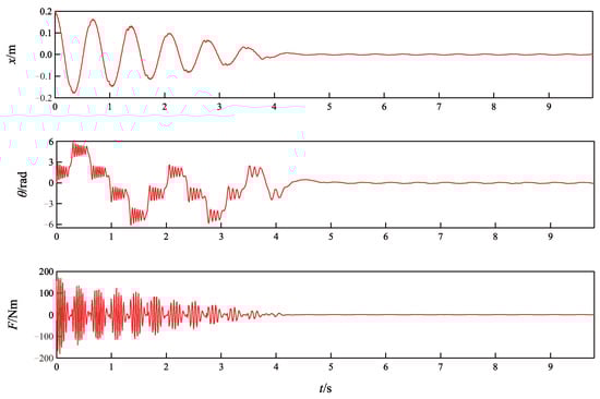The results of the simulation are presented in Figure 6. It is observed from Figure 6 that the cart and the ball can still be driven to the neighborhood of the origin even there exist parameter perturbations and vibration. The simulation results in this group verify that the proposed NGDBC has good robustness to external disturbances and parameter uncertainties. However, after repeated tests, it is found that the robustness of the proposed controller is limited, i.e., the cart and the ball will not be able to converge to a neighborhood of the origin when vibration or parameter perturbations over 20% are imposed.