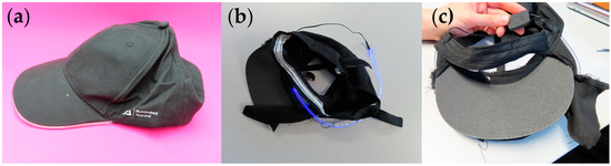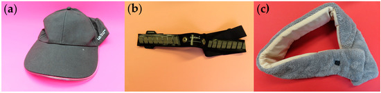 Figure 1. Commercial E-textile garments that were used for the tear-down analysis. (a) Heated scarf. (b) Light-up cap. (c) Heart rate monitoring band. - A light-up cap by Illuminated Apparel (London, UK). The product was purchased from Amazon. This represented an E-textile where the core electronic functionality (the light-up band) had been attached to the surface of the textile, with wiring running inside of the textile (Figure 1b).