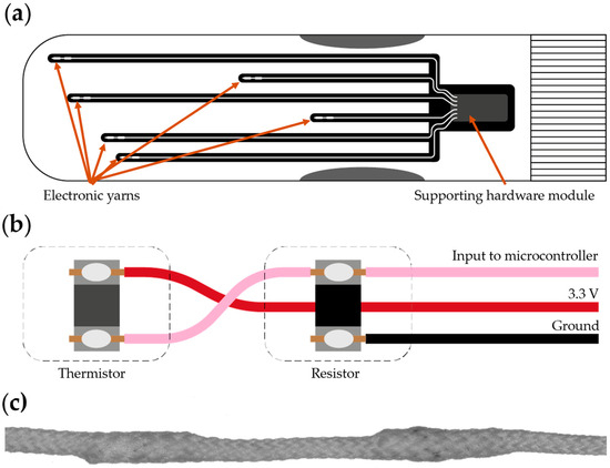 Temperature sensing sock prototype. (a) Schematic of the base of the sock showing the locations of the temperature sensing E-yarns and supporting hardware module. (b) Schematic showing the wiring of the embedded thermistor and resistor inside of the E-yarns. (c) Microscope image of a temperature sensing E-yarn. This image has been stitched together from two images.