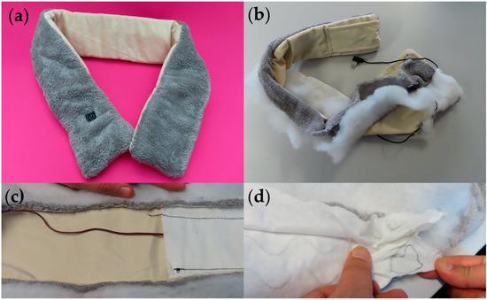 Heated scarf. (a) Product prior to the teardown. (b) Product following disassembly. (c) Detailed photograph of the wiring connection. (d) Detailed image of the conductive heating element.