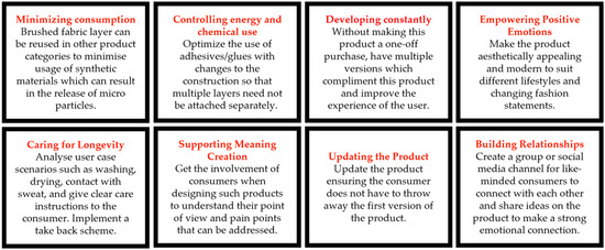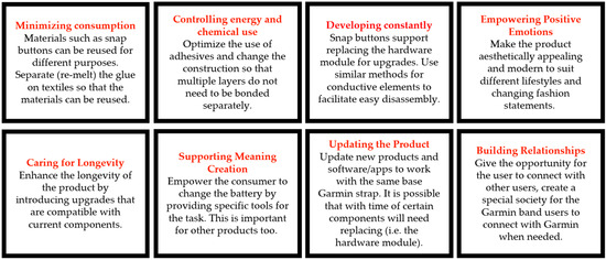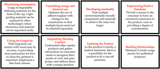 The main drawback of this product was the lack of information on the care label for the safe disposal of potentially harmful items. There was no easy means to segregate the product into textile and electronics waste. The low price point of these types of products motivates consumers to purchase more of these items and dispose of them as soon as they stop functioning. The circuitry arrangement and the lack of attention to detail when insulating the electronics from water ingress led to a strong assumption that the product may have a very short lifecycle. The construction of this product consisted of glue, stitching, and embroidery, which made it challenging to easily dismantle the electronic component from the textile or the nonwoven component. So, even if a take-back scheme was implemented, too much manual labor would be required to segregate the components, making such a scheme very costly to a company. Figure 4 shows the product analyzed using Kuusk’s eight sustainability qualities including suggestions on how to improve the product.
