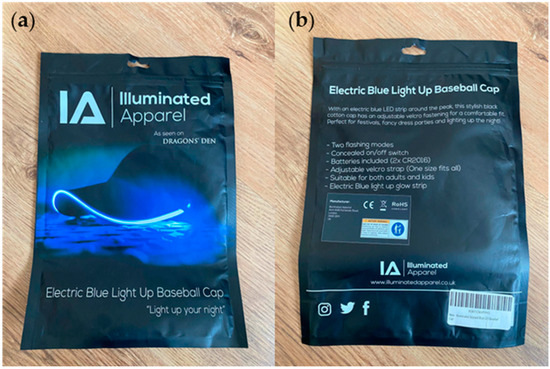 The light-up cap can be categorized as a fashion accessory at an affordable price point, costing GBP 12.95 when purchased on 21 September 2023. The product was delivered in company-branded packaging, which had information on the brand and the use of the product, as shown in Figure 5. The package consisted of the light-up cap and 2 × CR2016 batteries (3 V lithium batteries). Extra batteries can be purchased from any vendor once the provided batteries run out. The product did not have any care labels or leaflets outlining instructions to the consumer. The website describes how the product works. There were three light settings on the cap: a fast flash, a slow flash, and a solid color option. There was a small switch concealed in the brim of the cap.
