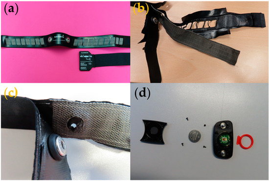 Heart rate monitoring strap. (a) Product prior to teardown. (b) Product following disassembly. (c) Detailed photograph of snap fastening connectors. (d) Photograph showing the disassembled supporting hardware module.