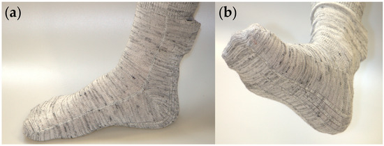Temperature sensing sock prototype created using electronic yarn technology. (a) Side view. (b) Bottom view showing the knitted channels into which the E-yarns are inserted.