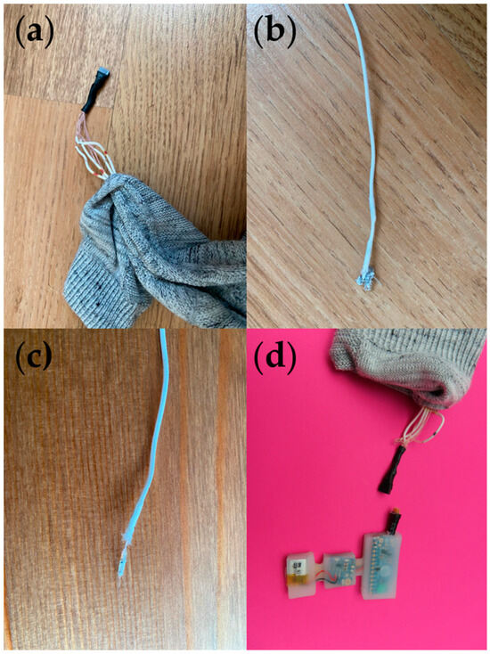 Temperature sensing sock prototype. (a) Image showing the connector to the supporting hardware module. (b,c) Images of the embedded electronic components. (d) Image of the supporting hardware module.