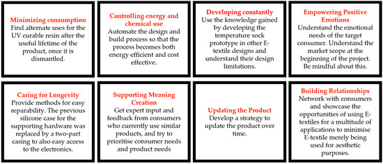 It is suggested that this framework should be employed during the early stages of product development. It would be ideal to use it during the E-textile product design stage, which is a suitable point to address the overall sustainability of the designed product where proactive decisions can be made to change materials, components, structures, and the construction of the product. The method can be used iteratively during the design stage, re-examining the maps as components change. The time spent on this approach during these initial stages of a product’s development will reflect well in the later stages of the design process and will help ensure that the resultant product has fully considered sustainability in its development.