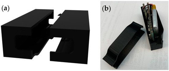New temperature sensing sock prototype hardware module. (a) Three-dimensional render of the casing. (b) Complete module.