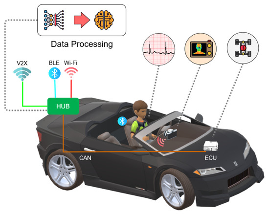 The different modules detailed in Section 2 and composing the proposed driver monitoring architecture transmit their collected data to the central hub, namely, the Intel NUC running Windows 10, located on board the vehicle and intended to work as a multi-interface gateway for data storage, fusion and processing. A pictorial representation of the data acquisition architecture of the proposed DMS is shown in Figure 4, where the connections between the different components are highlighted and the central hub is denoted as the Joint Driver–Vehicle Status (JDVS) module.