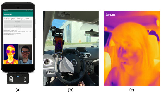 The second component integrated in the architecture of the proposed monitoring system is a FLIR One Pro LT thermal camera [34] (manufactured by Teledyne FLIR LLC, Wilsonville, OR, USA), which allows us to collect thermal information from specific regions on the body of the driver (namely, the face and nose) and from the surrounding environment. This device is composed of an RGB sensor and an infrared sensor, allowing us to simultaneously capture visible and thermal images or videos, respectively. Data may also be acquired according to a blended modality, providing a combination of visible and thermal outputs.