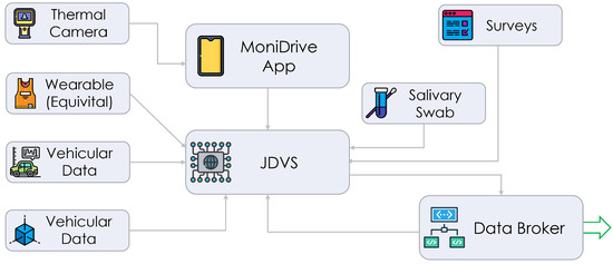 As future activities, the extraction of vehicular data from embedded inertial sensors and on-board units (OBUs) could be considered part of the proposed JDVS module. Also, the correlation between vehicular data and physiological parameters could be further investigated in order to evaluate the relationship between the driving behavior and the detected level of stress. Moreover, an optimization of the whole system could be foreseen by better integrating the thermal camera sensor in realistic driving scenarios. Finally, the use of different devices could be investigated, such as a smartwatch used to extract physiological measurements in a less-invasive way.