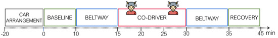 In this work, a first example of a driving protocol defined for acquiring data in real driving situations is shown in Figure 5. In detail, the driving protocol consists of specific epochs—with their duration shown in Figure 5—associated with different amounts of perceived stress induced by various external factors, e.g., road type, traffic conditions and co-driving. The face icons in Figure 5 delimit the time interval when additional stress is induced on the driver by the co-driver. To this end, it is useful to highlight how, in the specific context of real driving, the considered stress is a mental stress. Indeed, the stress induced by road and traffic conditions and by the presence of a co-driver is aimed at increasing the driver’s mental workload.