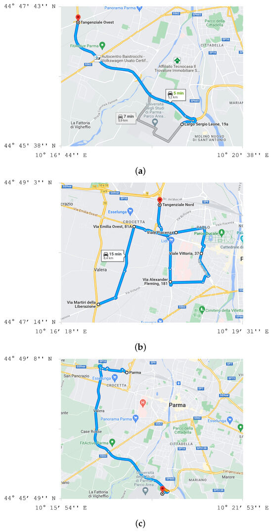 The experimental route followed during the aforementioned driving tests lies in the city of Parma, Italy, as shown in Figure 6. The maps in Figure 6a,c refer to beltway routes, whereas the map in Figure 6b refers to an urban route. For all maps, the precise latitude and longitude coordinates are shown.