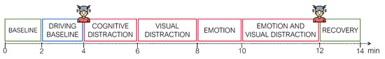 The driving protocol defined for acquiring experimental data in a simulated environment (i.e., a driving simulator) is defined in [39], where the designed experimental scenario is described. In particular, during the simulated driving sessions, the participants are required to perform a series of distracting tasks in order to increase their level of perceived stress. For the sake of completeness, the various phases of a 14 min simulated driving test are shown in Figure 7, where, in detail, (i) reference data were acquired during the baseline phases and (ii) cognitive, visual and emotional distractions are emulated during the corresponding phases (as highlighted in Figure 7) in order to acquire data in stressful conditions. In particular, during the first cognitive distraction phase, the driver is asked to perform a memory exercise, named n-back (with ), where they have to listen to a sequence of letters read by an external voice and declare a match if and only if the last heard letter corresponds to the second-to-last heard letter. Then, the driver is asked to perform a second task to emulate both cognitive and visual distraction, during which they have to write on a cellphone a sequence of city names read by an external voice. During the last emotional distraction phase, the driver listens to an audio track and is asked to write on a cellphone the emotions that they are feeling. Finally, data at rest are collected during the recovery phase. It is finally noteworthy to highlight that none of the participants took part in both real and simulated driving scenarios, and that since cognitive, visual and emotional distractions are induced in the simulated driving tests, the type of stress in this specific scenario is considered both mental end emotional.
