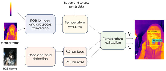 Thermal images and additional information of interest—namely, temperature ranges detected by the thermal camera and the pixel coordinates of the framed hottest and coldest points—were acquired by the FLIR One Pro Lt device described in Section 2.2 every 5 s and processed according to a dedicated algorithm, for which its block diagram is shown in Figure 8.