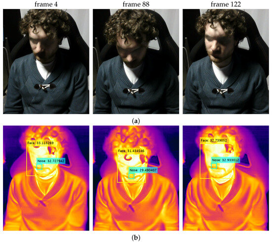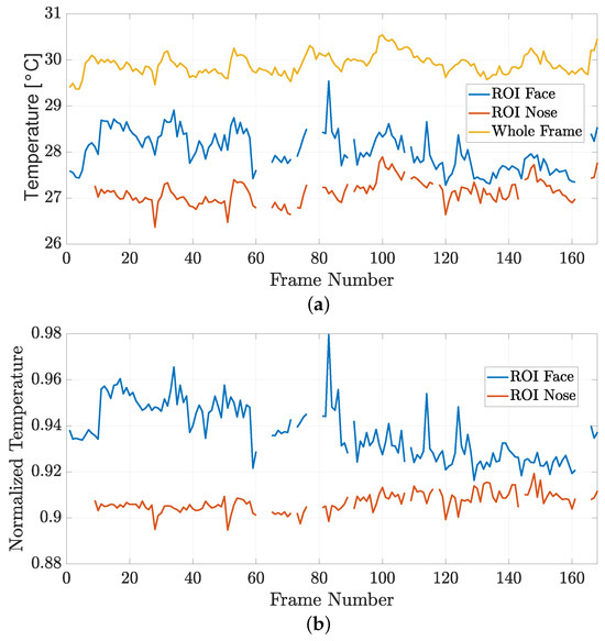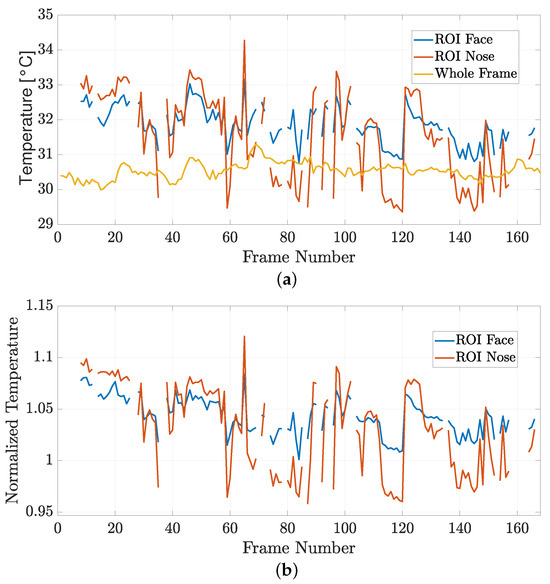 For Figure 12a and Figure 13a, the mean temperature values (dim: [°C]) were computed by applying Equation (3) on the drivers’ face and nose ROIs reported for each acquired frame, along with the mean temperature extracted from the whole frame (detected and extracted through the processing performed by means of the MediaPipe Face Detector framework). However, at some time instants, artifacts, possibly due to movements of the subjects, may lead to incorrect detections, as visible in Figure 12 and Figure 13, at those frame indices where the temperature curves are not defined.