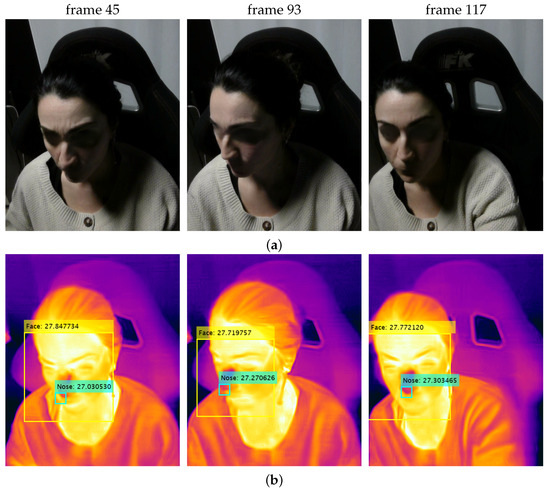 The results of two simulated driving sessions, denoted as and , are detailed hereafter, with examples of RGB and thermal frames extracted from the corresponding video sequences by the FLIR One Pro Lt sensor and properly processed by the algorithm described in Section 4.2, as shown in Figure 9 and Figure 10, respectively.