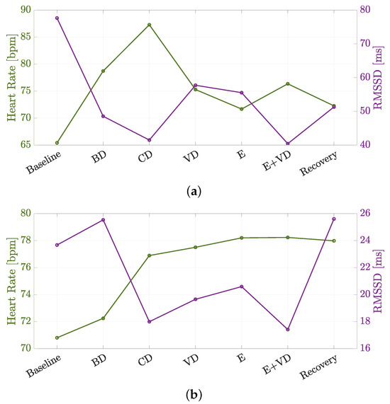 Considering Figure 11a, the most significant activation of the subject is observed during the CD phase, where a very small value of RMSSD (namely, ms) is computed, and a very high value of mean HR (namely, bpm) is recorded, indicating a reduced activity of the vagus nerve, as typically observed in stressful circumstances. A similar condition is observed during the E+VD phase, where the value of the RMSSD index is ms, and the mean HR is bpm. Likewise, considering Figure 11b, the subject is mainly activated during the CD and E+VD phases, where the values of the RMSSD are ms and ms, respectively, while the values of the mean HR are bpm and bpm, respectively.