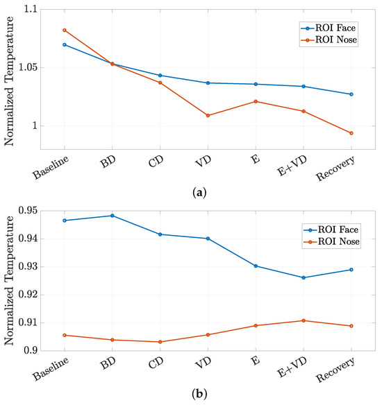 In order to neutralize the effects of environmental factors, e.g., air conditioning and/or heating inside the vehicle’s cabin, the mean temperature values extracted from face and nose ROIs are also normalized, for each acquired frame, with respect to the mean temperature obtained over the whole frame. In fact, this normalization allows us to compensate the effects of undesired temperature oscillations inside the vehicle’s cabin, which are unrelated to the stress perceived by the drivers. To this end, the normalized temperature curves associated with and are shown in Figure 12b and Figure 13b, respectively.