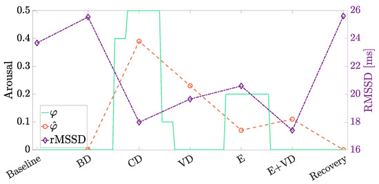 In detail, with reference to Figure 15, there is a clear interest in evaluating the mean arousal , computed as the arithmetic average of the arousal values (obtained each 5 s on the basis of Algorithm 1) over each phase of the driving protocol. It can be observed that shows a clear “inverse” behavior with respect to the RMSSD processed over each phase, thus confirming how the arousal estimation might be effective in these scenarios. Finally, it should be mentioned that the current version of the arousal algorithm only considers HRV data, whereas the integration of thermal data is yet under investigation. In this first experimental analysis, we limited the investigation to the IoT-based system behavior evaluated in terms of thermal data acquisition from specific regions of interest (namely, face and nose).