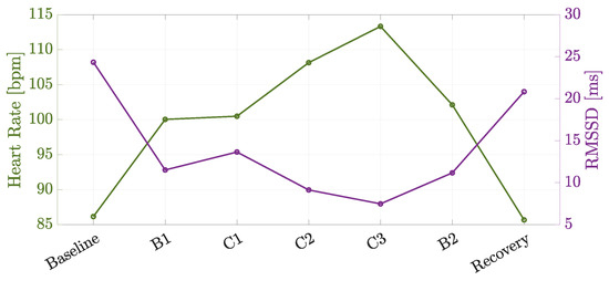 Hence, it can be observed that in stressful conditions, i.e., from phases C1 to C3 in Figure 16, the driver is subject to a psycho-physiological activation, with the mean HR exhibiting an increasing trend. At the opposite, RMSSD decreases, suggesting a reduction in the vagus nerve activity and an increase in the perceived stress.