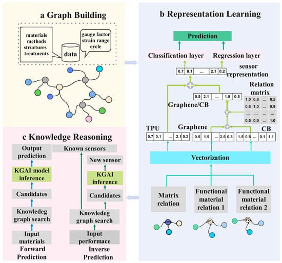 Illustration of a KGAI architecture developed with three procedures for (a) knowledge graph building of strain sensors, (b) representation learning of the knowledge graph (feature engineering), (c) knowledge reasoning of sensor design (performance prediction, sensor design query, and exploration).
