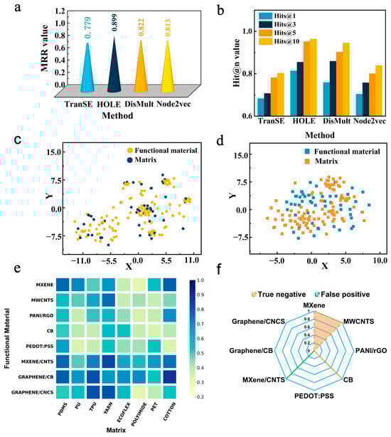 The evaluation of the KGAI method. (a,b) Values of MRR and Hit@n metrics of knowledge graph construction. (c,d) Cluster atlas of different combinations of representation methods (improved method with considering the correlation between functional materials and hole method without considering the correlation between functional materials) via unsupervised learning after dimensionality reduction. (e) The heat map of functional materials and flexible matrix. The colors scale with the values of the cosine similarity between embeddings. The dark color of the squares means a strong correlation. (f) The value of false positive (value = 1, wrong prediction in database) and true negative of designs (value = 3, undetected designs in database).