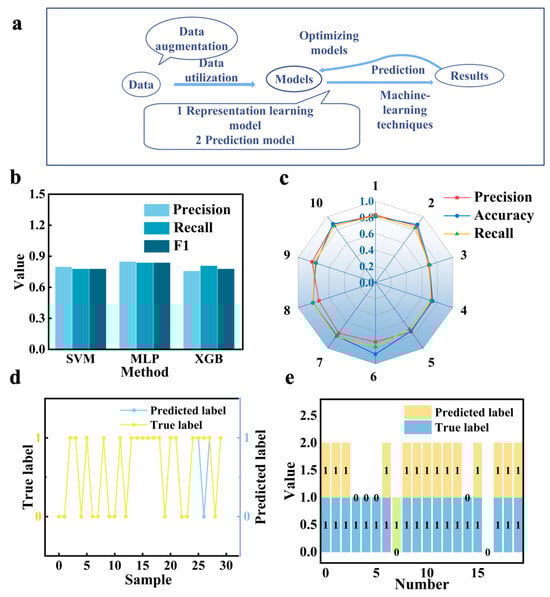 (a) The design process of the whole method. (b) The indicators (Precision, Accuracy, and Recall) of three methods for classification tasks by 10-fold cross-validation. (c) The indicators of the MLP method in ten different test datasets. (d,e) The predicted labels and true labels of train and test samples (one and four misclassified samples, respectively).