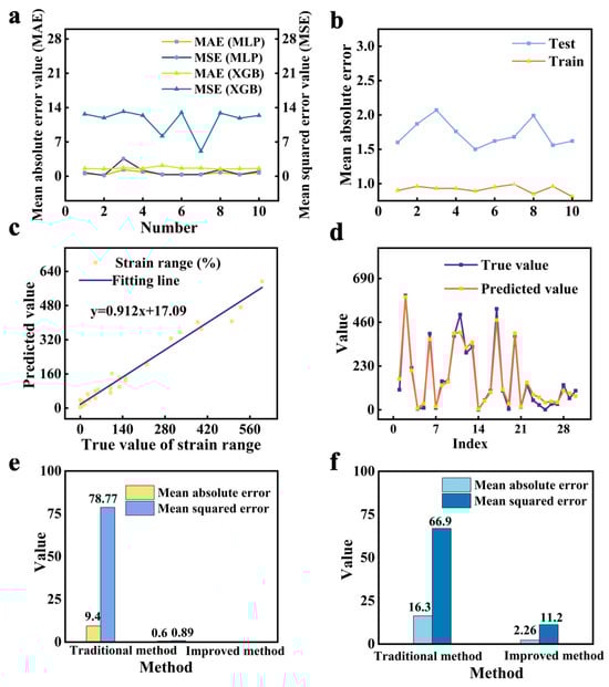 (a) The indicators of the XGB and MLP method for performance prediction. (b) The mean absolute error of 10-fold cross-validation of the test dataset. (c) The model prediction value and the true value for train samples. The line represents a prediction formula for the strain range. (d) The model prediction and the true value of test samples for strain range. (e,f) Evaluations of the design prediction. (e) The error prediction performance of the traditional method (only using the text feature without the correlation) and our KGAI method (using the graph feature containing the text feature and relationship feature) in the training process. (f) The error prediction performance of the traditional method and our KGAI method on the test dataset.