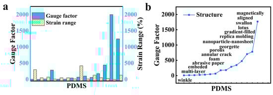 The trend of flexible substrate (PDMS) in the knowledge graph. (a) The sensor performance of strain range and gauge factor. (b) The trend of gauge factor under different structures of PDMS.