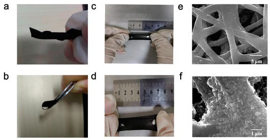 Photographs of the film showing excellent flexibility when (a) twisted, (b) bent, and (c,d) stretched. (e,f) Top views of the composite film under the SEM observation with different scales (5 μm and 1 μm).