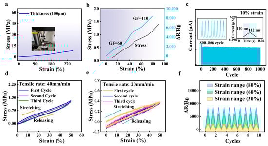 Main metrics of the strain sensor. (a) The stress under different strain ranges. (b) The relative resistance–strain variation curves and stress–strain curves of strain sensors. (c) The durability of the sensor. The insert pictures are the subgraph of the cycle (800–806) and response/recovery times of the sensor. (d,e) The three cycles of the stretching process with a tensile rate of 40 mm/min and 20 mm/min, respectively. (f) The cycle stability of relative resistances under different strains (35%, 45%, and 80%).