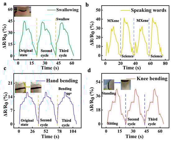 According to the above results, the prepared composite sensor has excellent properties such as extensive strain range, flexibility, and good sensitivity, showing great prospects in wearable devices. Consequently, it was used to detect human motion across several levels, including swallowing, speaking, hand bending, and knee movements. The small strain of swallowing was first tested by attaching the sensor to the neck, followed by testing the speaking process of two words (“MXene” and “science”) (Figure 8a,b). Different changes in relative resistance during these activities caused by vocal cord vibrations were captured, indicating sensitivity to tiny motions. Figure 8c exhibits that the sensor responded to hand curvature with a consistent correlation between the bending angle and resistance change. To monitor larger joint movements, measurements were performed while sitting and standing by mounting the sensor on the knee (Figure 8d). The resistance-time waveform presented a clear and periodic response, showing promising potential for human-friendly rehabilitation. The pressure characteristic was also observed according to different forces (Figure S3).