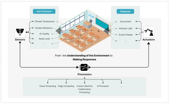 A representative example of a smart classroom sensor system consisting of (1) sensors that collect classroom environment and biological data, (2) processors that process data and make instructions (usually cloud computing, edge computing, human–computer collaborative processing, AI processors, etc.), and (3) actuators that receive instructions and respond to classroom feedback in the form of sound or indicator lights.